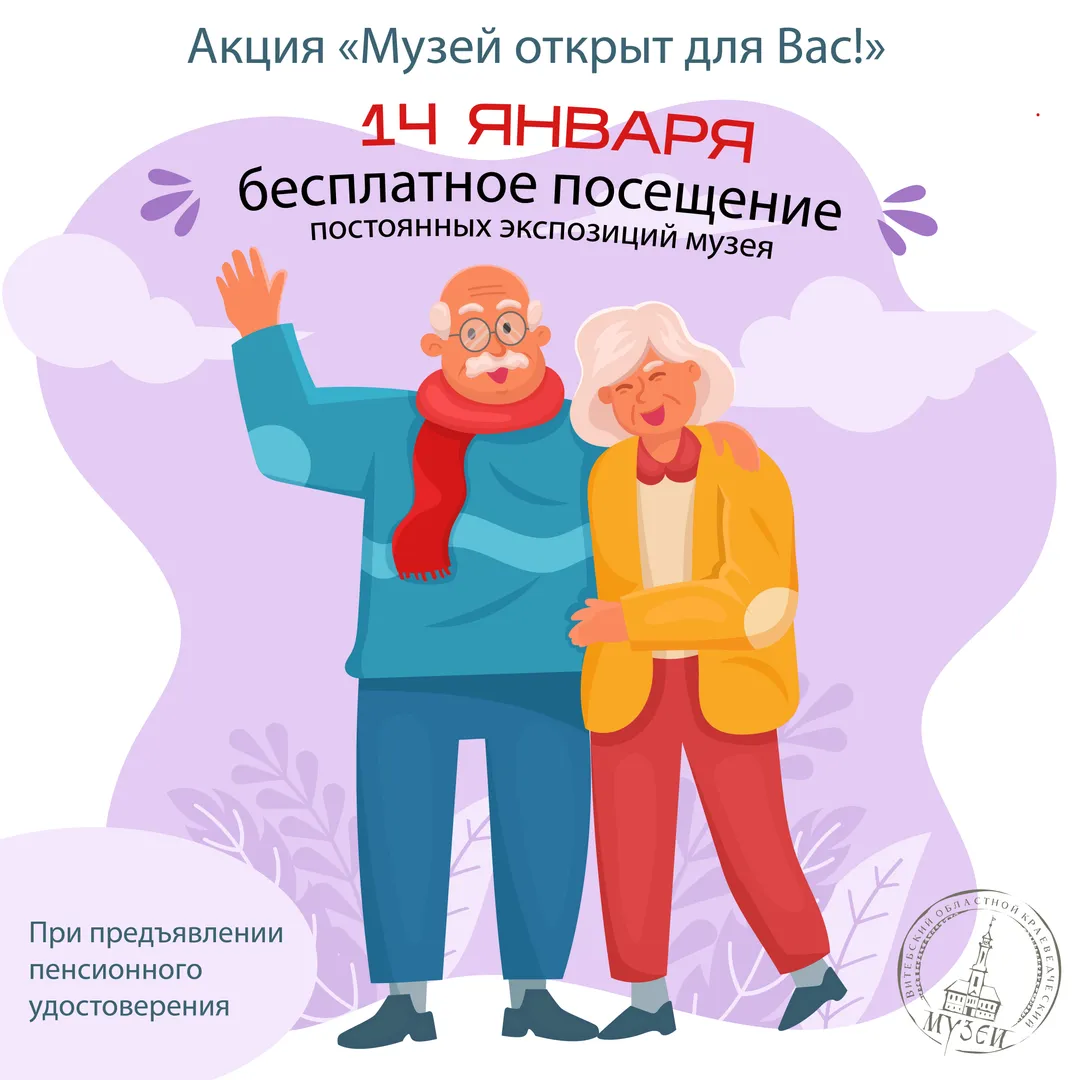 В рамках Республиканской новогодней благотворительной акции «От всей души» и акции «Музей открыт для Вас!» УК «Витебский областной краеведческий музей» приглашает 14 января 2026 года граждан пенсионного возраста бесплатно посетить постоянные экспозиции из фондов музея.