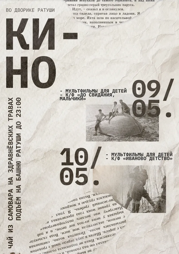 Приглашаем на кинопоказы ко Дню Победы во внутреннем дворике Ратуши (со стороны сквера Маяковского).